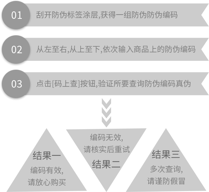 二维码查询 使用智能手机中的扫描二维码APP 应用程序扫描标签标识上的二维码 验证商品真伪.(需开启数据网络或 WiFi环境下)